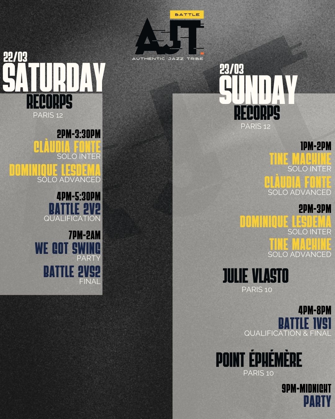 This is a 1vs1 battle open to all solo dance styles (house, hip hop, waacking, popping, salsa, locking, mambo, breaking, jazz rock, etc.) with the requirement to exclusively express yourself to jazz music.